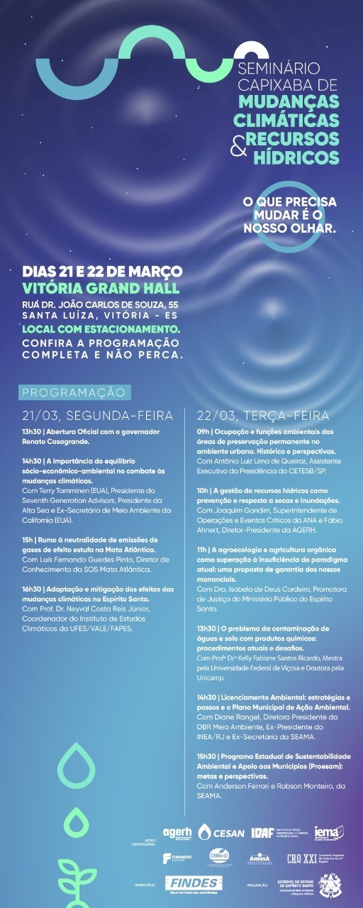 O evento será realizado no cerimonial Vitória Grand Hall, no Barro Vermelho, em Vitória, e reunirá especialistas em meio ambiente do Espírito Santo, do Brasil e do mundo para discutir soluções de combate às mudanças climáticas e preservação dos recursos hídricos em nosso Estado e em todo o planeta.
